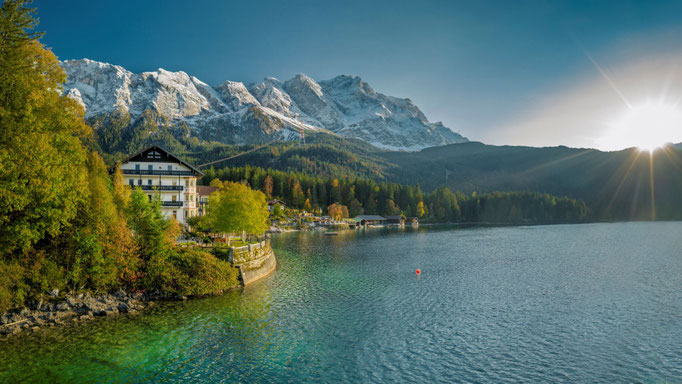 Wir werden im 4-Sterne-Superior-Hotel Eibsee - wie der Name sagt -DIREKT am wunderschönen Eibsee untergebracht sein - ein magischer Ort am Fuße der Zugspitze.